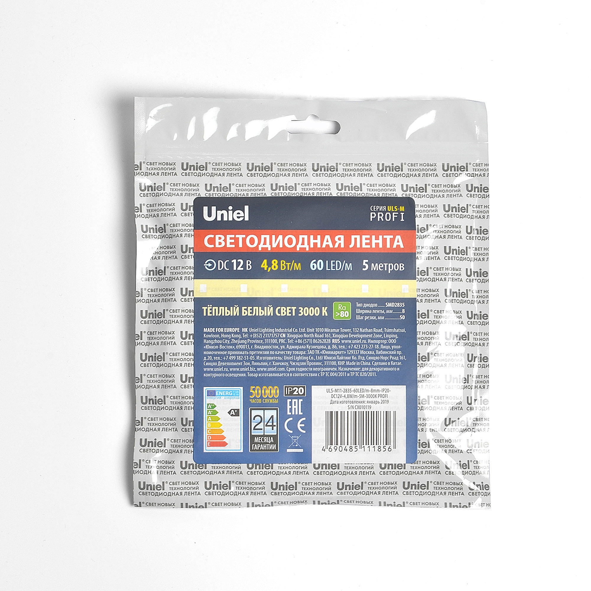LED лента Uniel ULS-M11-2835-60LED/m-8mm-IP20-DC12V-4,8W/m-5M-3000K PROFI катушка в герметичной упаковке