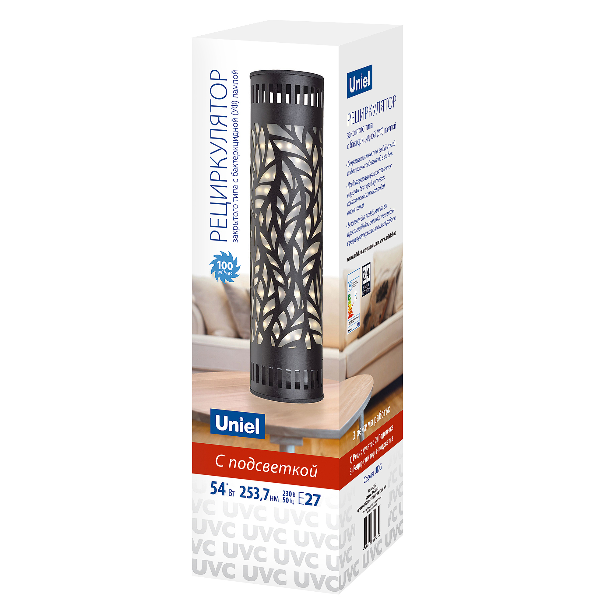 Рециркулятор закрытого типа с бактерицидной лампой Е27 Uniel Udg рециркуляторы UDG-V100A UVCB/4000K D02 BLACK
